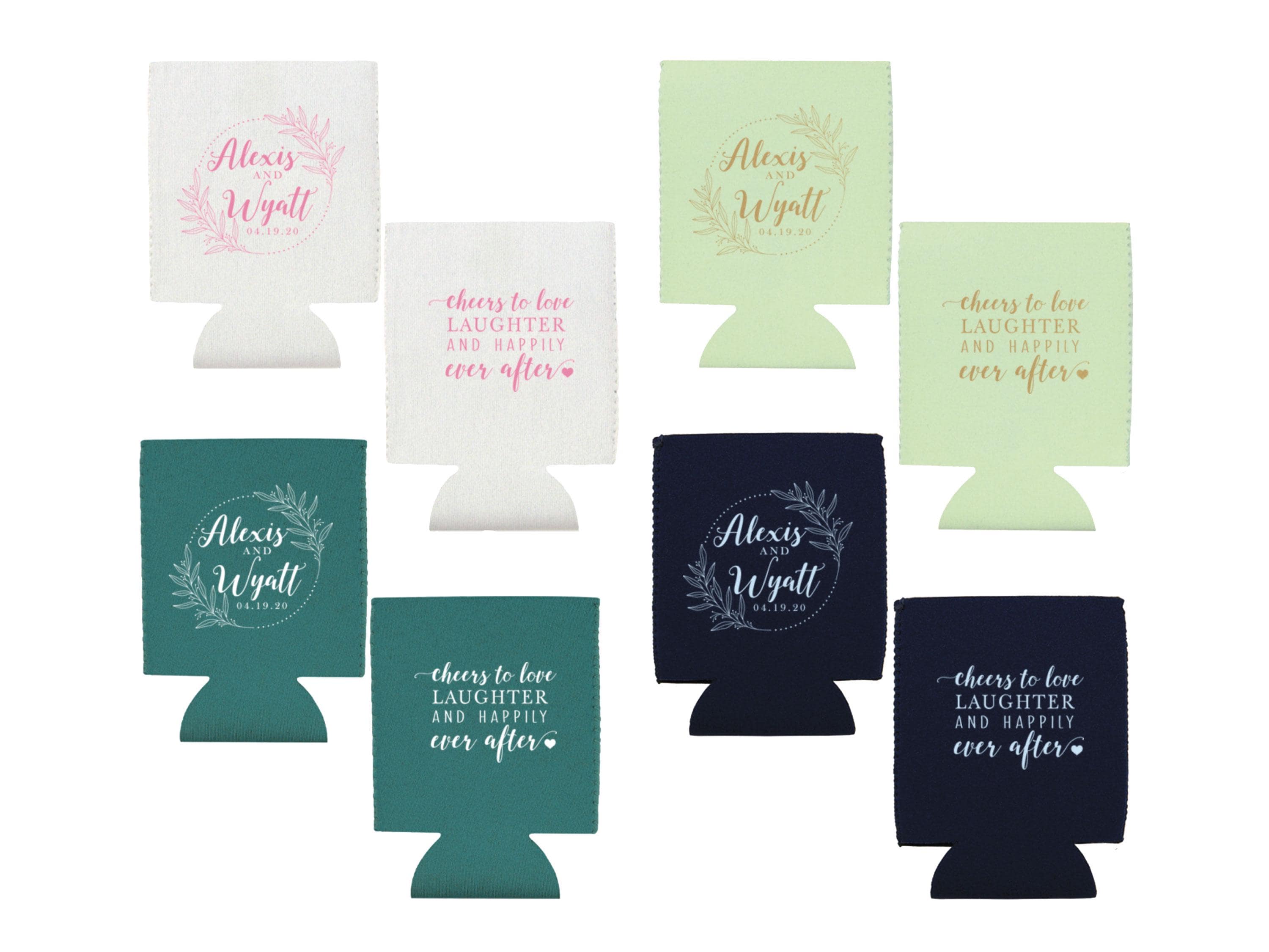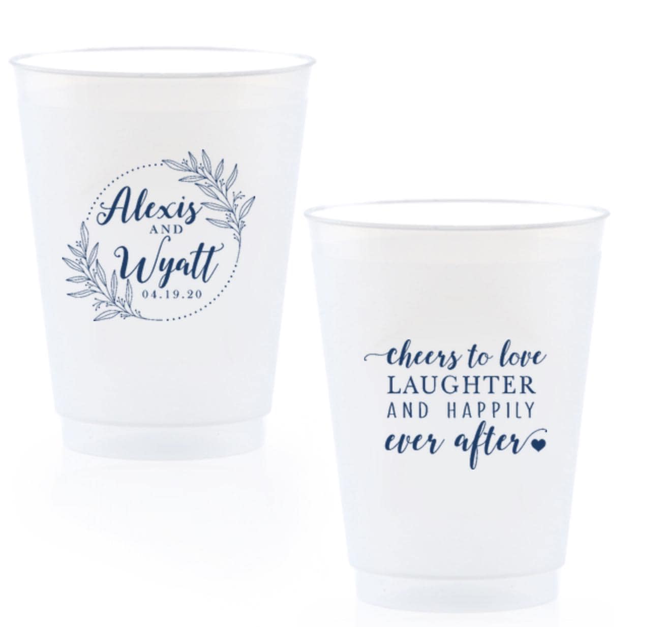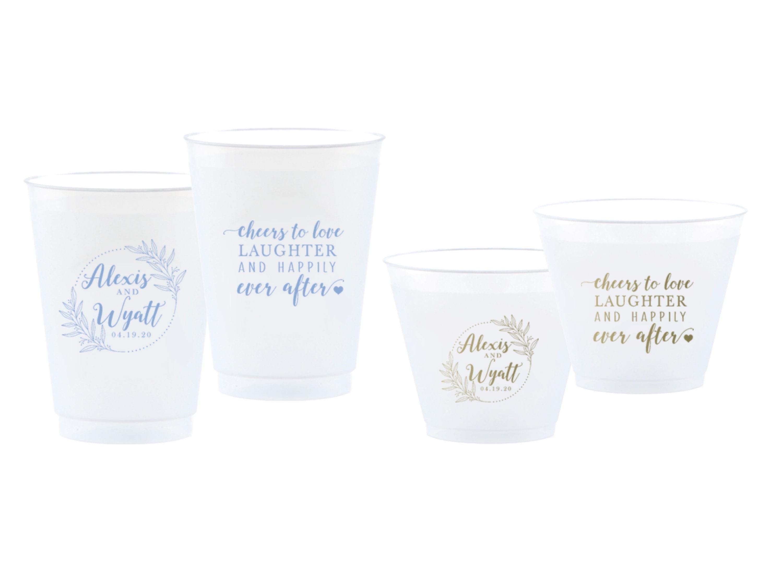 Reusable shatterproof cups featuring a leafy wreath with your names/date and “cheers to love, laughter & happily ever after”—perfect for signature drinks and take-home favors.
