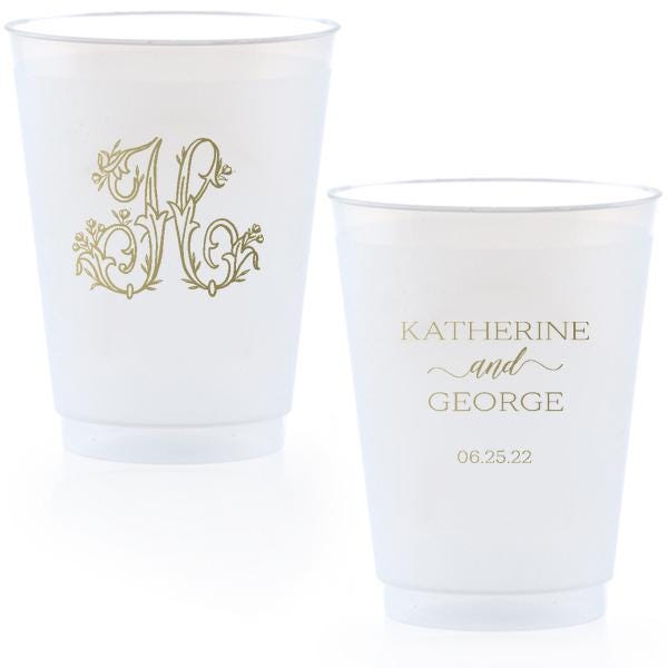 Elegant reusable cups with an ornate monogram on one side and your names/date on the other—perfect for signature drinks, toasts, and take-home favors.