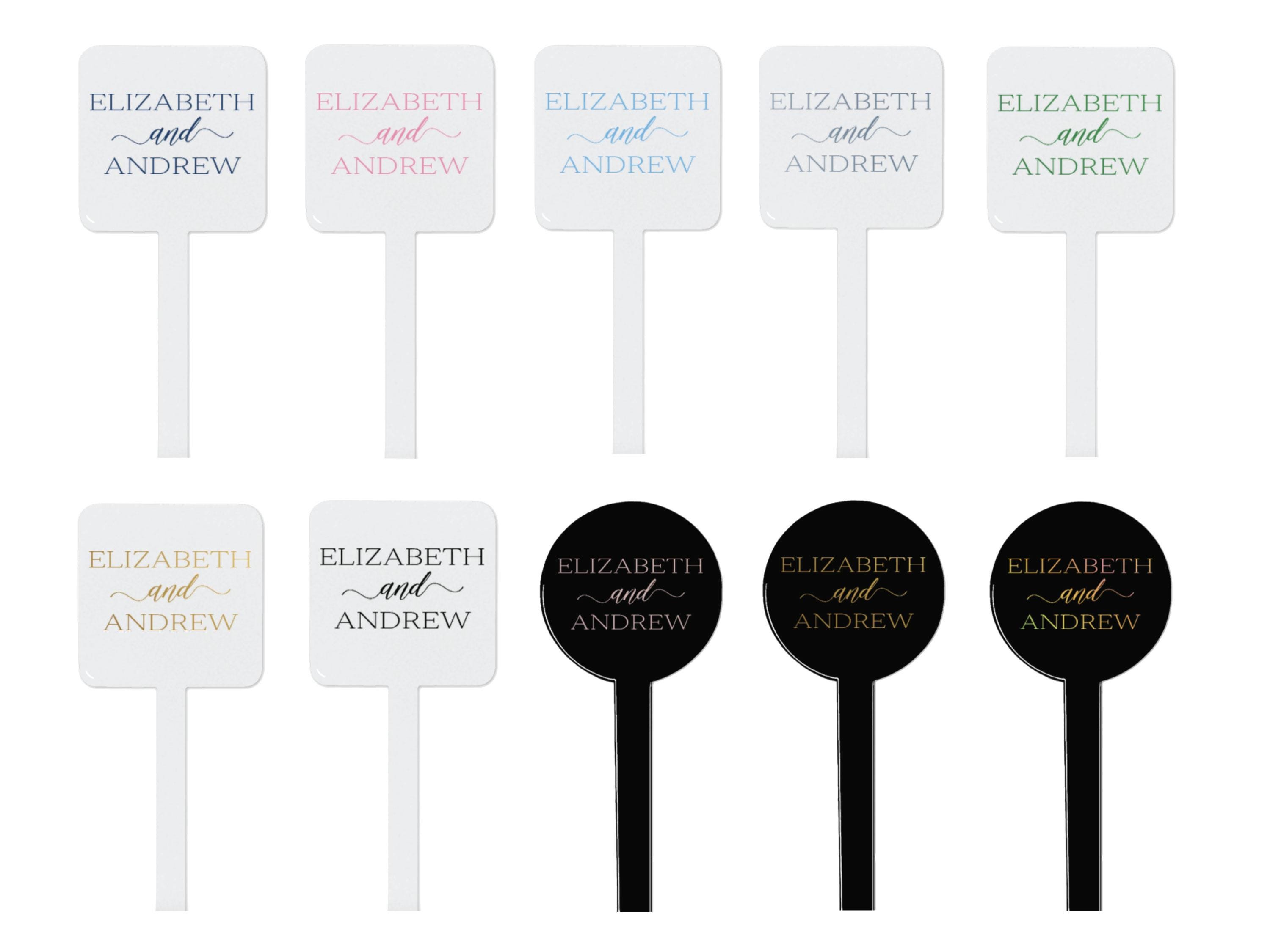 Choose from oval (5"), round (6"), or rectangle (6") shapes in natural wood or durable plastic. Personalization is placed on the “head” of the stir stick – add names, initials, dates, or a custom design. Available single or double-sided, with a variety of colors to match your theme.