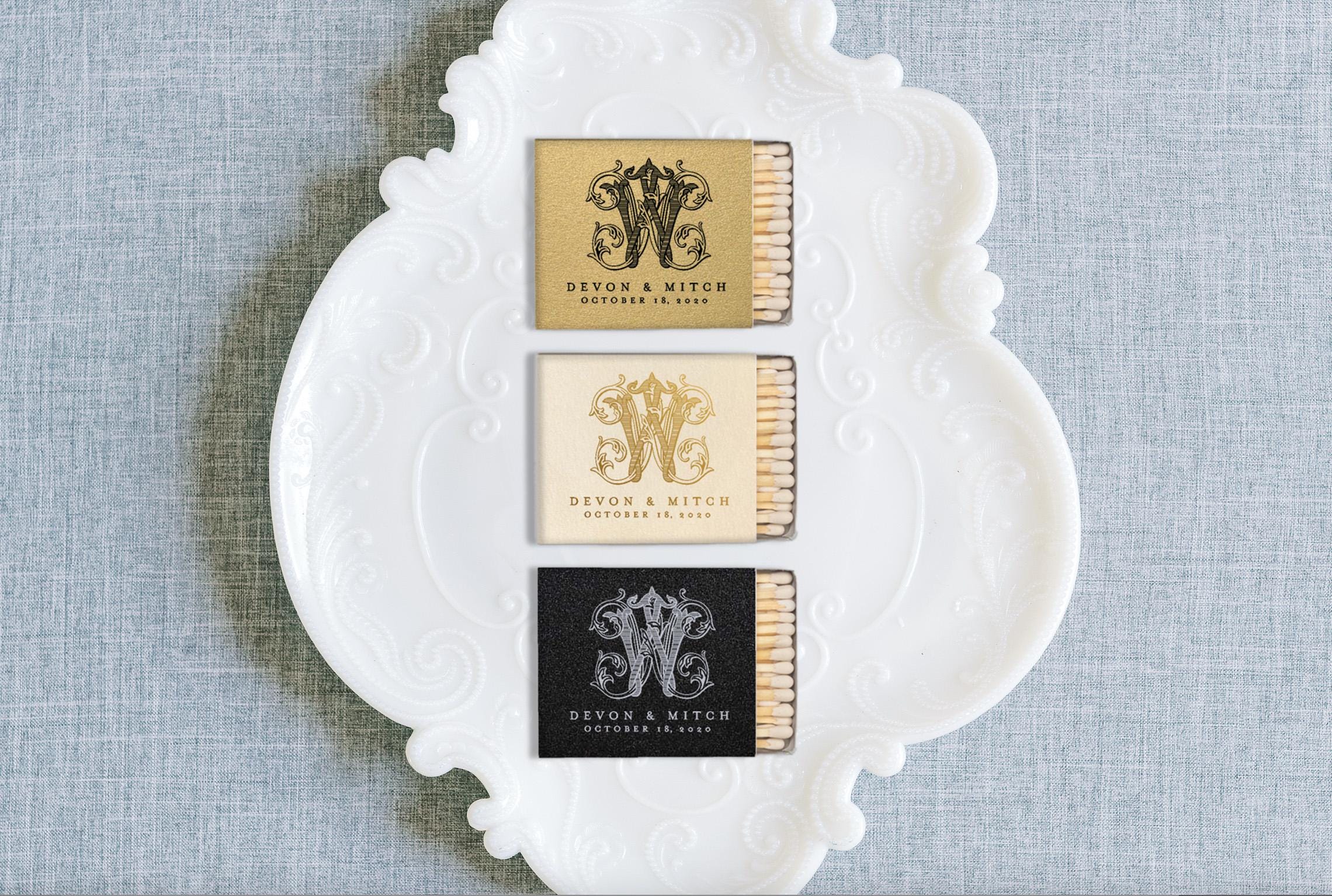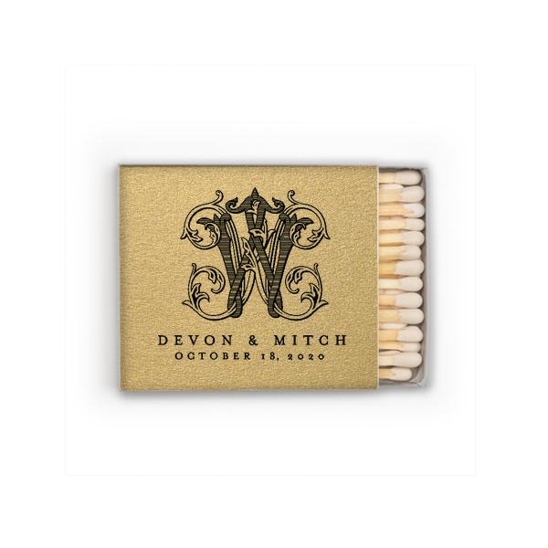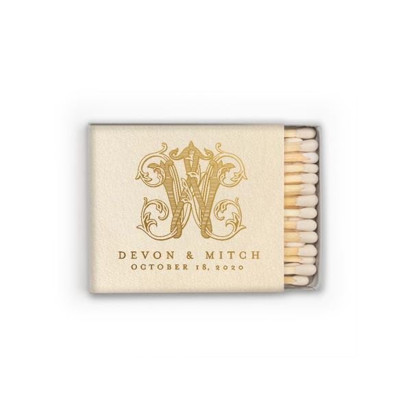 Elegant, fully printed matchboxes featuring a fancy monogram and names will make custom keepsakes perfect for weddings, receptions, and welcome bags.