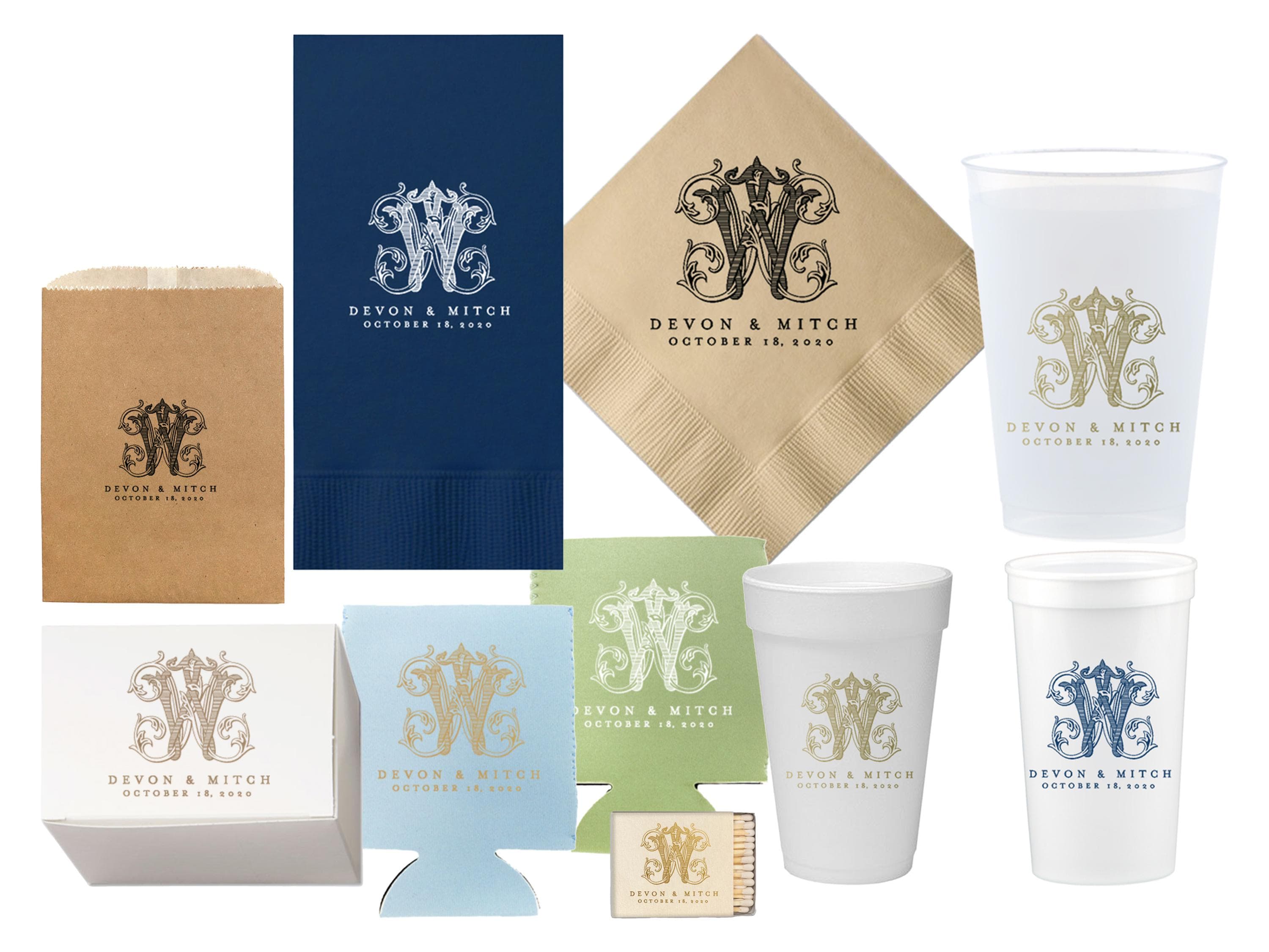 • Matching items available: napkins, hand towels, coasters, cups, signage, favor bags, and more